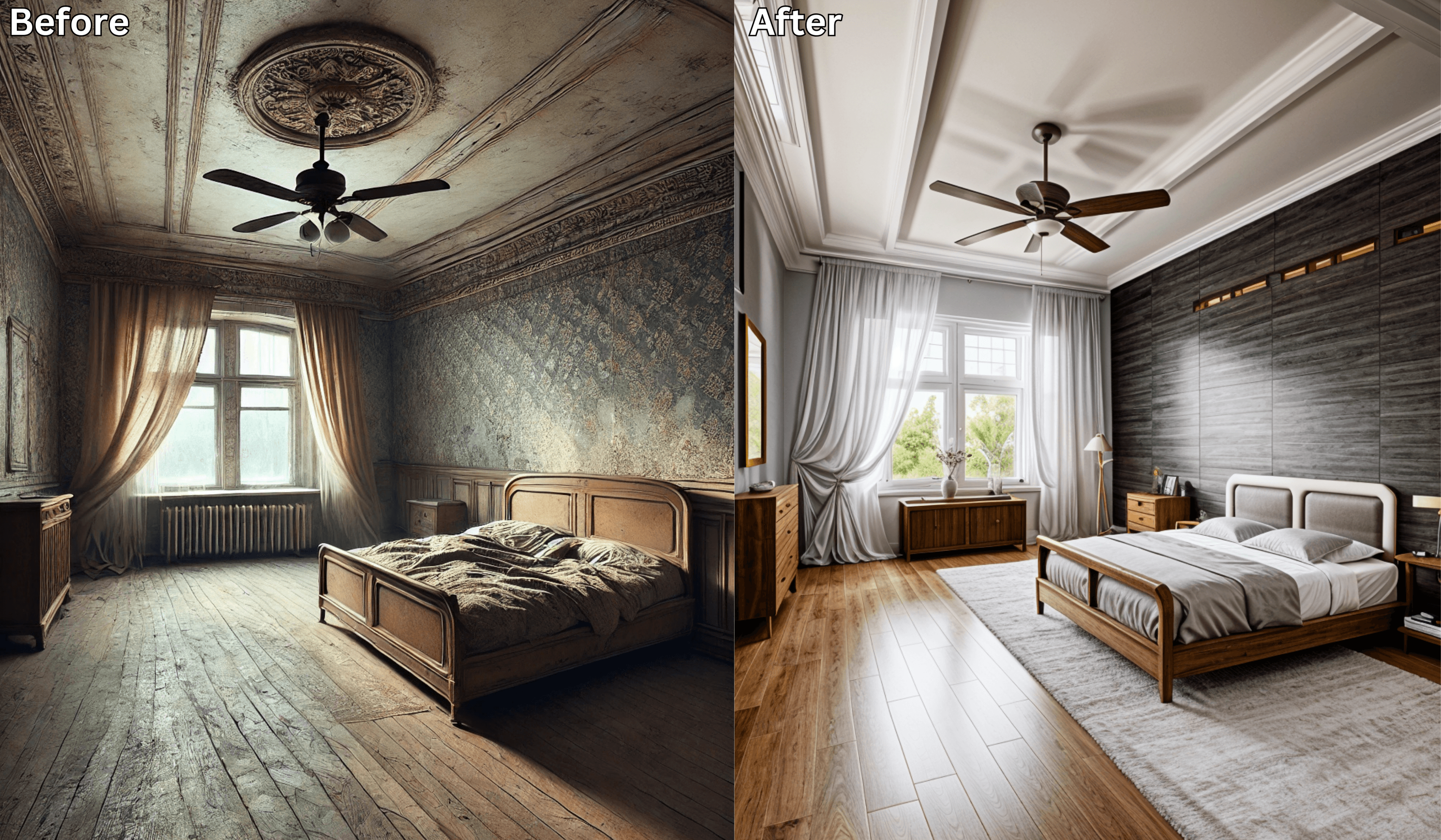 AI generated before and after bedroom renovation showing dramatic transformation from outdated to luxury modern design